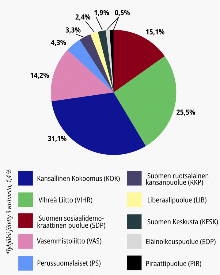 Kuten odottaa saattoi, kokoomus sai puolelleen yksittäisistä puolueista runsaslukuisimman kannattajajoukon. Yllättävää kuitenkin oli kapeahkoja stereotypioita haastava liberaalien, kirjoitushetkellä eduskunnan oppositiossa olevien ja keskikäytävän vasemmalla puolella istuvien puolueiden yhteenlaskettu suurmenestys: vihreät, Sdp ja vasemmistoliitto yhdessä haalivat 54,7% kannatuksen. Perussuomalaisten kannatus oli huomattavan vähäistä verrattuna puolueen kansalliseen kannatukseen. Vaikka perussuomalaiset keräävät nuorten keskuudessa paikoin suurtakin kannatusta, ei liene yllättävää, etteivät helsinkiläiset yliopisto-opiskelijat osu puolueen kohderyhmän ytimeen. Keskustan vähäinen kannatus perustunee myös juuri otoksen kaupunkikeskeiseen painotukseen. Edukuntapuolueista kristillisdemokraatit ja Liike Nyt eivät keränneet kyselyssä ainuttakaan ääntä.