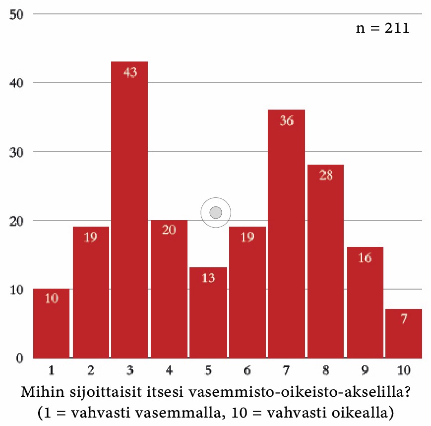 Inter Vivosin kyselyn vastaajista 49,8% sijoitti itsensä oikeisto-vasemmisto-akselin keskikohdan vasemmalle puolelle, kun taas 50,2% vastaajista sijoitti itsensä sen oikealle puolelle. Kun tulosta verrataan siihen yltiöoikeistolaiseen mielikuvaan, joka oikkareita leimaa, huomataan jakauman olevan odotettua monivivahteisempi. Kyselyn vastaajat näyttävät myös sijoittavan itsensä mieluummin joko maltillisesti oikealle tai maltillisesti vasemmalle sen sijaan, että asemoituisivat janan ääripäihin tai sen keskikohdalle.